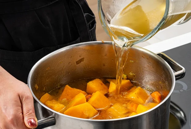 Залейте овощи куриным бульоном, доведите до кипения и варите до мягкости овощей.