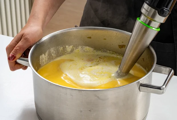 Снимите суп с огня и пробейте его погружным блендером до однородности.