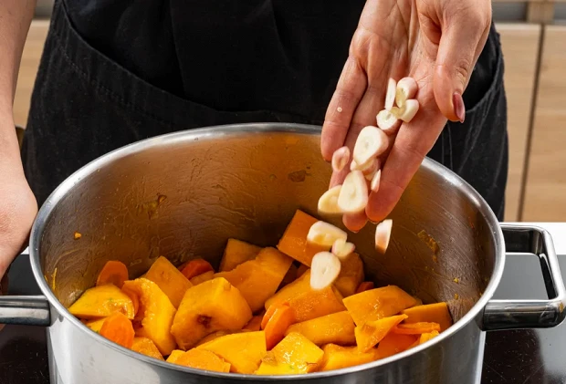 Добавьте морковь, тыкву и имбирь и жарьте примерно 10 минут. За минуту до конца жарки добавьте к ним чеснок.