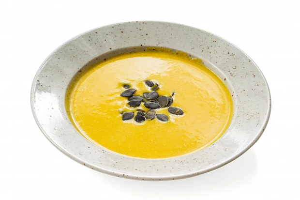 Подавайте классический тыквенный суп, украсив жареными тыквенными семечками.