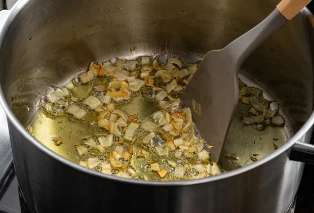 В кастрюле разогрейте растительное масло. Обжарьте на нем лук до золотистого цвета.