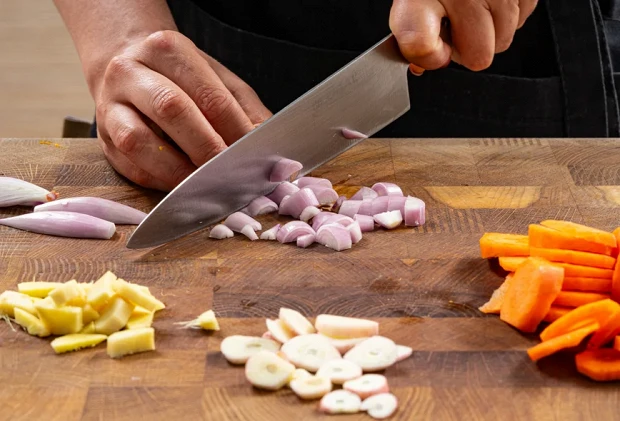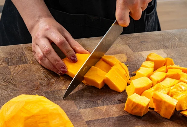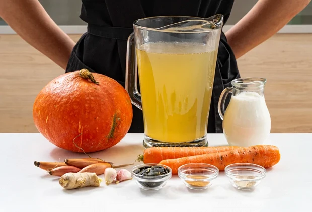 Подготовьте все ингредиенты: 1 килограмм тыквы, 50 грамм лука-шалота, 2 зубчика чеснока, 2 моркови, 20 грамм имбиря, 1,5 литра куриного бульона, молотый кардамон и корица, взятые по вкусу, 250 мл сливок 33%-ных, 30 мл растительного масла, соль, молотый черный перец и тыквенные семечки, взятые по вкусу.