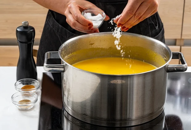 Верните суп на плиту. Посолите, поперчите, добавьте корицу и кардамон. Доведите суп до кипения и проварите еще 3 минуты.
