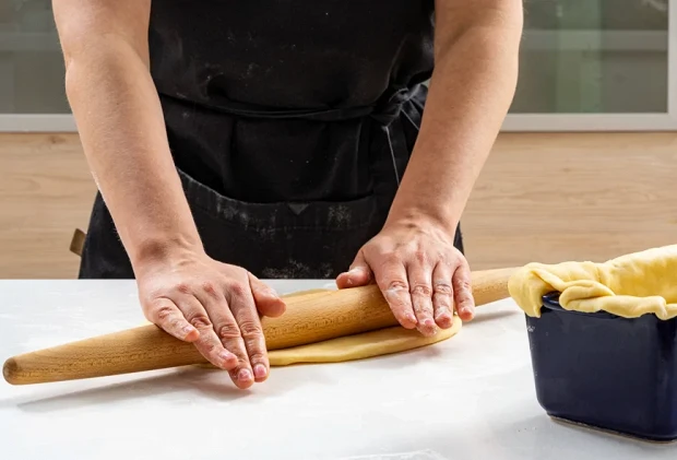 Форму для запекания основательно смажьте оставшимся сливочным маслом и выстелите ее бумагой для выпечки. Две трети теста равномерно раскатайте и выложите в форму. Оставшуюся треть тоже раскатайте — это будет крышка пирога.