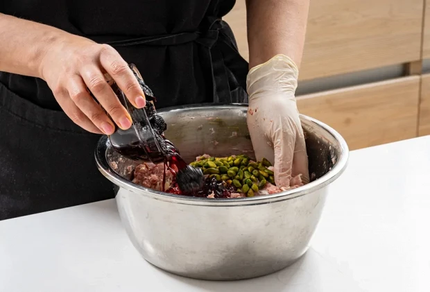 В миске смешайте фарш, бекон, корейку, чеснок и шалфей. Приправьте солью и белым перцем, взятыми по вкусу, и тщательно перемешайте. Добавьте очищенные фисташки (при желании их можно чуть раздробить) и чернослив вместе с портвейном. Еще раз аккуратно перемешайте.