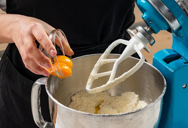 Нарежьте кубиками 160 грамм размягченного сливочного масла — размягчить его надо заранее при комнатной температуре, чтобы оно органично вошло в тесто. Просейте муку и соль. Смешайте все ингредиенты в миксере с помощью насадки лопатки. Добавьте оливковое масло и 2 яичных желтка, смешайте до однородности.