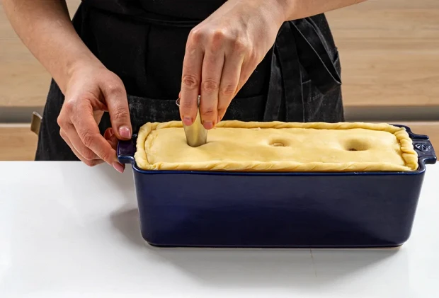 Накройте заготовку крышкой из теста. Срежьте с крышки лишние края и сделайте из них бортики: косичкой, колбаской, как угодно. Затем сделайте в крышке пате три отверстия — для выхода пара.