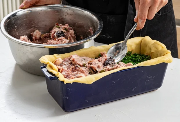 Выложите половину фарша в форму, смажьте его паштетом и посыпьте петрушкой. Следом выложите оставшийся фарш. Такая многослойность позволяет создавать знаменитые рисунки начинки пате-крута (они бывают разными) — то, что интересно разглядывать во время еды.