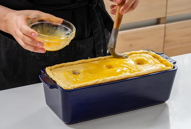 Смажьте пате-крут желтком и отправьте его на 20 минут в духовку, разогретую до 200 градусов. Далее снизьте температуру до 180 градусов и выпекайте еще 40 минут или пока внутренняя температура пате не достигнет 67–68 градусов — для этого надо воспользоваться термометром. Готовый пате-крут остудите на решетке.