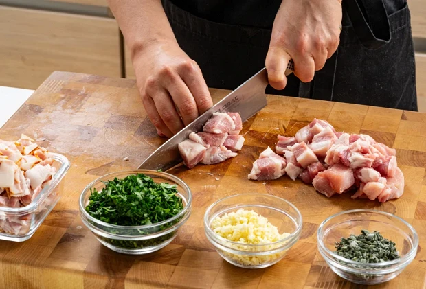Мелко порубите свежий шалфей, чеснок и петрушку. Бекон и корейку нарежьте небольшими кусочками — небольшими, потому что они не будут проворачиваться через мясорубку и отправятся в таком виде прямиком в паштет.