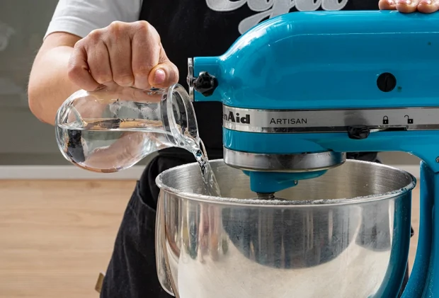 Затем постепенно введите в будущее тесто воду, после чего замешивайте его в течение 1–2 минут. Готовое тесто накройте пищевой пленкой и отставьте в сторону.