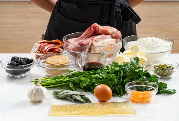 Подготовьте все ингредиенты для приготовления пате-крута. Вам понадобятся: 500 грамм пшеничной муки, 180 грамм сливочного масла, 15 мл оливкового масла, 12 грамм соли, 3 яичных желтка, 150 мл воды, 800 грамм свиной лопатки, по 200 грамм бекона, свиной корейки и утиного паштета, 8 листочков шалфея, 150 грамм чернослива, 100 мл портвейна, 70 грамм фисташек, 30 грамм чеснока, 100 грамм петрушки, молотый белый перец, корнишоны и зернистая горчица, взятые по вкусу.