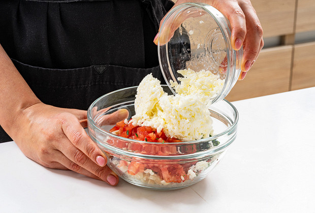 Помидор разрежьте на четыре части, удалите сердцевину с семенами, мякоть нарежьте мелкими кубиками.