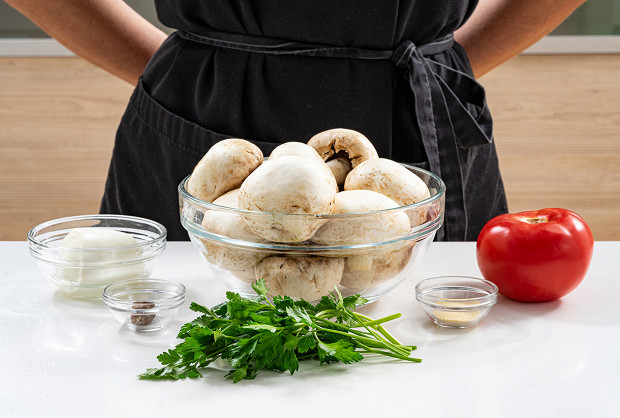 Подготовьте ингредиенты. На 12 грибных шляпок (примерно столько поместится на противень) вам понадобится 130 грамм моцареллы, 1 крупный помидор, 15 грамм петрушки, 0,5 чайной ложки молотого сушеного чеснока и мускатный орех по вкусу. Выставьте духовку на 200 градусов и дайте ей разогреться.
