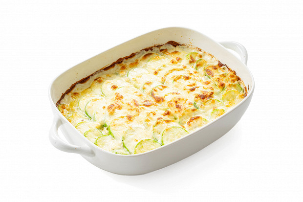 Обычно гратен делают из нарезанной тонкими пластинками картошки, прослаивая их сливками и покрывая сырной корочкой и в результате получая вкусное, но зашкаливающее по количеству калорий блюдо. Замена картофеля на кабачок делает калорийность гратена не столь пугающей. А в остальном ингредиенты остаются неизменными: не забудьте про щепотку муската, именно его тонкий привкус делает гратен настоящим.