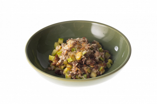 Вариант быстрого ужина, когда в дело идет все, что есть под рукой. Упаковка мясного фарша, кабачок, рис (возможно и вчерашний), сыр (в рецепте голландский, но можно и без определенной национальности) и чеснок. Можно нарезать кабачок шайбами и нафаршировать, но еще быстрее — просто нарезать кабачковую мякоть кубиками, смешать во всеми остальными ингредиентами и отправить в духовку. Всего 10 минут — и сытное, исходящее мясным ароматом блюдо у вас на столе.