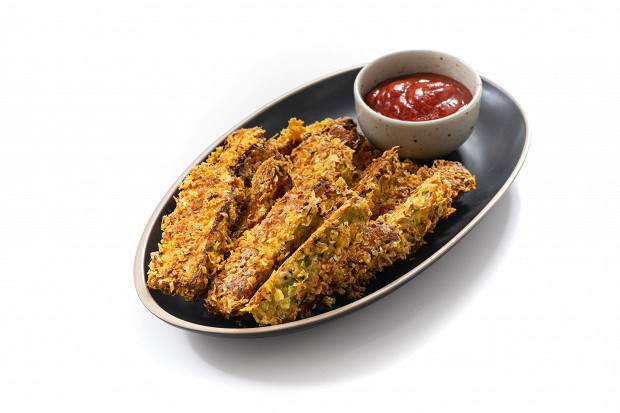 Простой и очень эффектный рецепт, в котором кабачки режутся крупными брусками и покрываются яичным кляром с добавлением молотых сухарей, специй и тертого пармезана. В духовке все это собирается в единый кулинарный сюжет: кабачок внутри сырной оболочки успевает пропечься, но не раскваситься, сыр аппетитно тянется за вилкой, сухари хрустят, а нам немедленно хочется добавки.