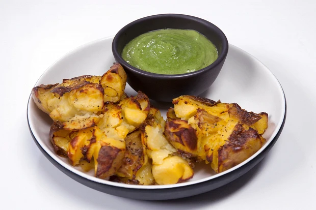 Американская версия крошки-картошки — smashed potato. Картофель сначала приваривают до полуготовности, а потом, сделав на кожице разрез, смачно сплющить ее чем-то тяжелым. Тогда любой соус или наполнение без препятствий пройдет во все щели и помятости. Тут это зеленый соус из авокадо, которому придают характер зелень и арахис.