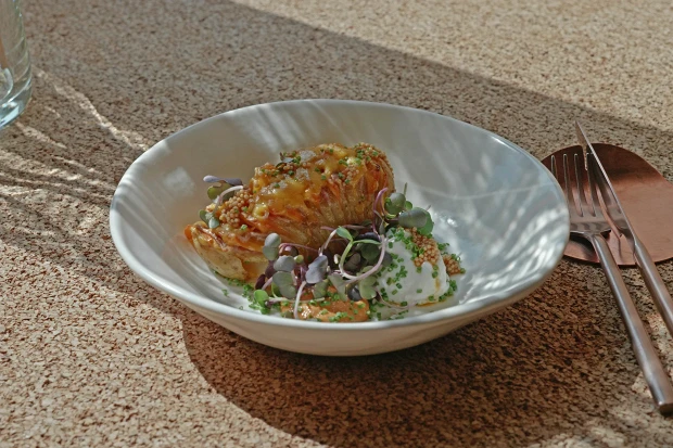 Хассельбак — шведское изобретение. Картофель или любой другой овощ подходящей плотности и размера эффектно нарезают гармошкой и вкладывают в эти разрезы начинку. Версия начинки от Михаила Курохтина, шеф-повара ресторана Midsummer, — говяжий бекон и копченый чеддер. Но в картошку-гармошку можно вложить, например, ломтики ветчины или соленой рыбы, а если хотите получить сугубо вегетарианское блюдо — то жареные баклажаны.
