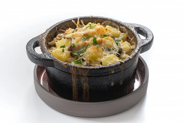 Порционное блюдо, которое запросто можно поставить на праздничный стол — стоит подобрать горшочки посимпатичнее. Внутри горшочка — выкладка, знакомая всем по рецепту жульена: сначала картошка, на картошку — грибы, потом все это заливается сливками (не забудьте добавить щепотку муската) и наверх трется сыр, который в потечет, подрумянится и превратится в роскошную золотистую шапку.
