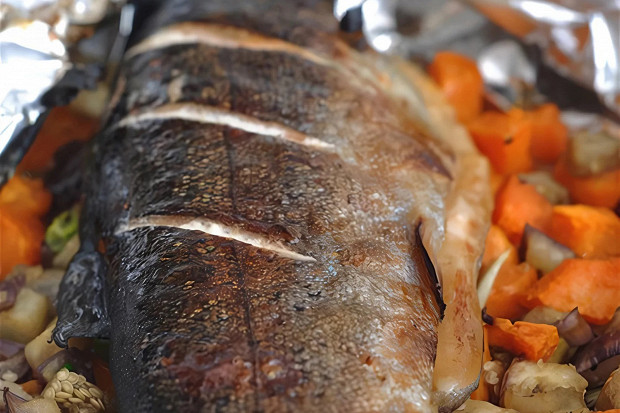 - Чтобы рыба на прилипла к фольге и не развалилась, когда вы будете ее доставать, смажьте поверхность фольги маслом, влейте немного бульона или уложите рыбу на «подушку» из овощей, которые дадут сок. Важно также не слишком плотно «пеленать» рыбу, оставляя в конверте из фольги воздушную прослойку, — тогда воздух внутри будет циркулировать свободно, рыба будет готовиться более равномерно и точно не пригорит.