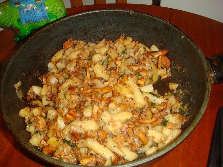 5В полуготовую картошку добавить лук, перемешать. Через несколько минут — лисички. Перемешать.
