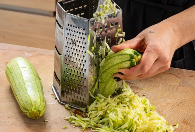 Вмешать кабачки в тесто и дать ему постоять 5 минут. За это время ингредиенты проникнут друг в друга и превратятся в единое целое.