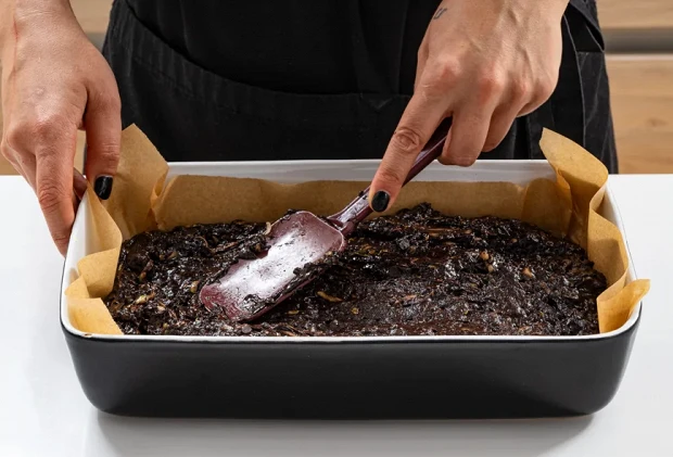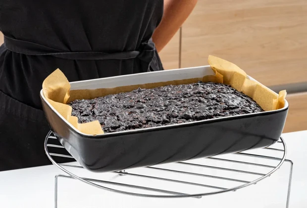 Готовому брауни дать остыть в форме. Лучше поставить ее на решетку — так внизу будет циркулировать воздух, и форма с десертом будет остывать равномерно.