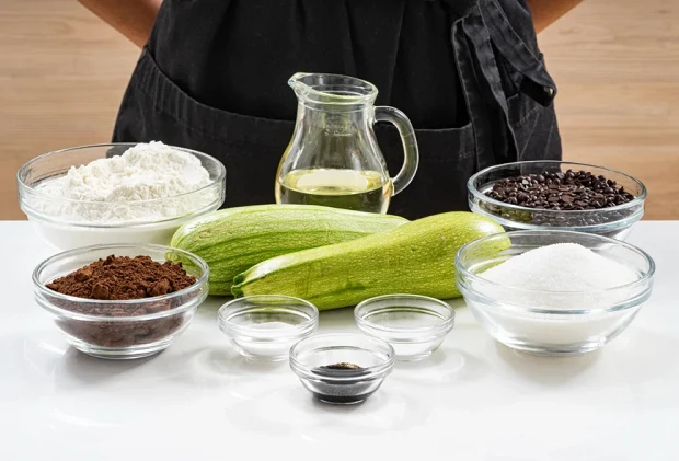 Подготовить все ингредиенты. В тесто для брауни уйдет 500 грамм мякоти кабачка, 200 грамм горького шоколада, 65 грамм какао-порошка, 120 мл растительного масла, 200 грамм сахара, 260 грамм муки, 1,5 чайной ложки соды, 1 чайная ложка соли (ну удивляйтесь, в присутствии соли вкус шоколада проявляется ярче) и 1 чайная ложка ванильной пасты. Заранее разогрейте духовку до 180 градусов.