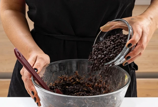 Добавить в тесто шоколад и снова перемешать. Мы используем специальный кондитерский шоколад в «каплях», но можно добавлять и обычный плиточный — перед этим нужно измельчить его ножом, чтобы он распределился по тесту.