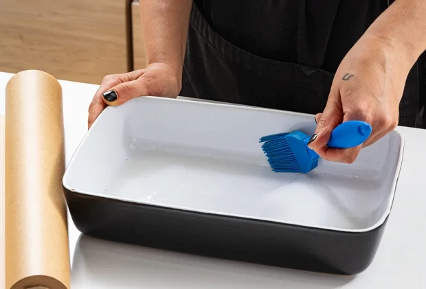 Взять прямоугольную форму 20х30 см с высокими бортами, смазать ее маслом и выстелить бумагой для выпечки.
