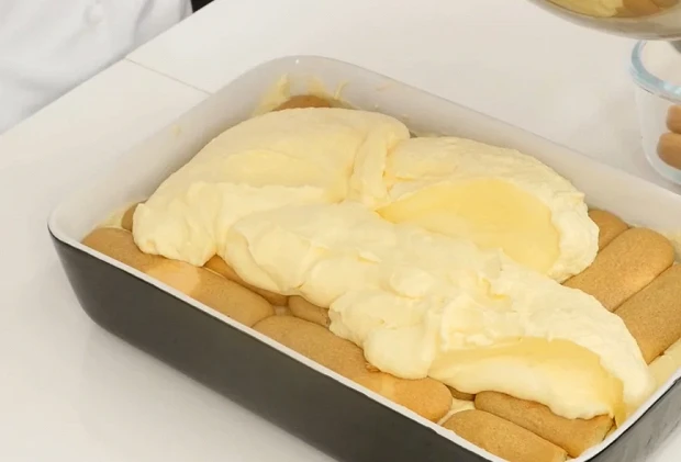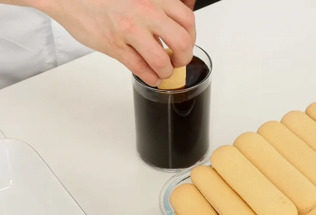 На печенье выложите половину крема из маскарпоне. Сверху — второй слой печенья, предварительно обмакнутого в кофе. Покройте оставшимся кремом. Уберите тирамису в холодильник на 4–8 часов.