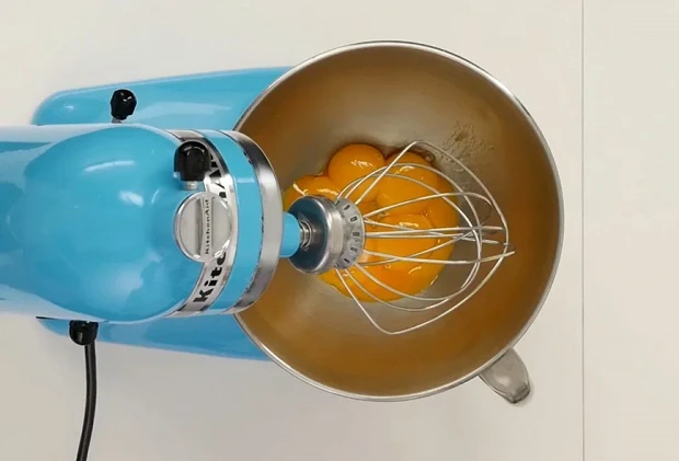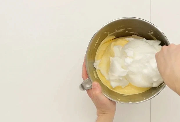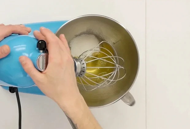 Отдельно взбейте белки с оставшимся сахаром до глянцевой текстуры и жестких пиков.