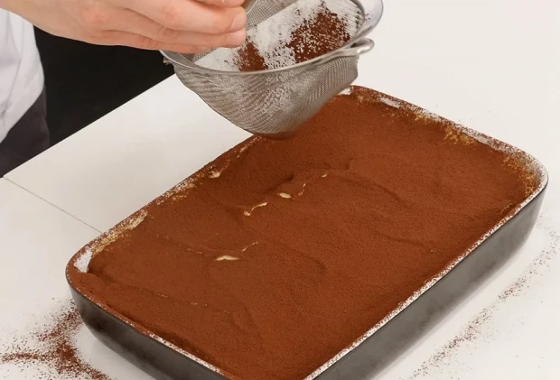 Перед подачей посыпьте десерт какао. Если делать это через ситечко, то слой получится равномерным.