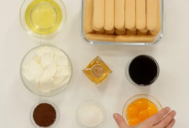 Приготовьте ингредиенты. Понадобятся 6 яиц, 100 грамм сахара, 400 грамм печенья савоярди, 375 мл (1,5 стакана) свежесваренного кофе, 2 столовые ложки ликера амаретто, 20 грамм какао-порошка, 450 грамм маскарпоне.