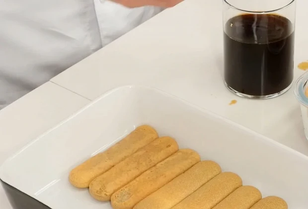 Вылейте кофе в миску с широким дном, обмакните в него печенье и уложите в в один слой на дно формы размером 20х30 см.