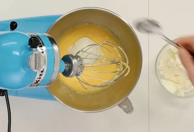 Продолжая взбивать, понемногу добавьте маскарпоне.