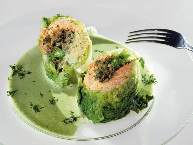 Самые нежные голубцы в нашей подборке. С листьями латука нужно быть осторожнее: это тот случай, когда передерживать блюдо ни в коем случае нельзя, латук не терпит такого обращения. Зато если следовать инструкции, то получится очень нежное и тонкое блюдо.